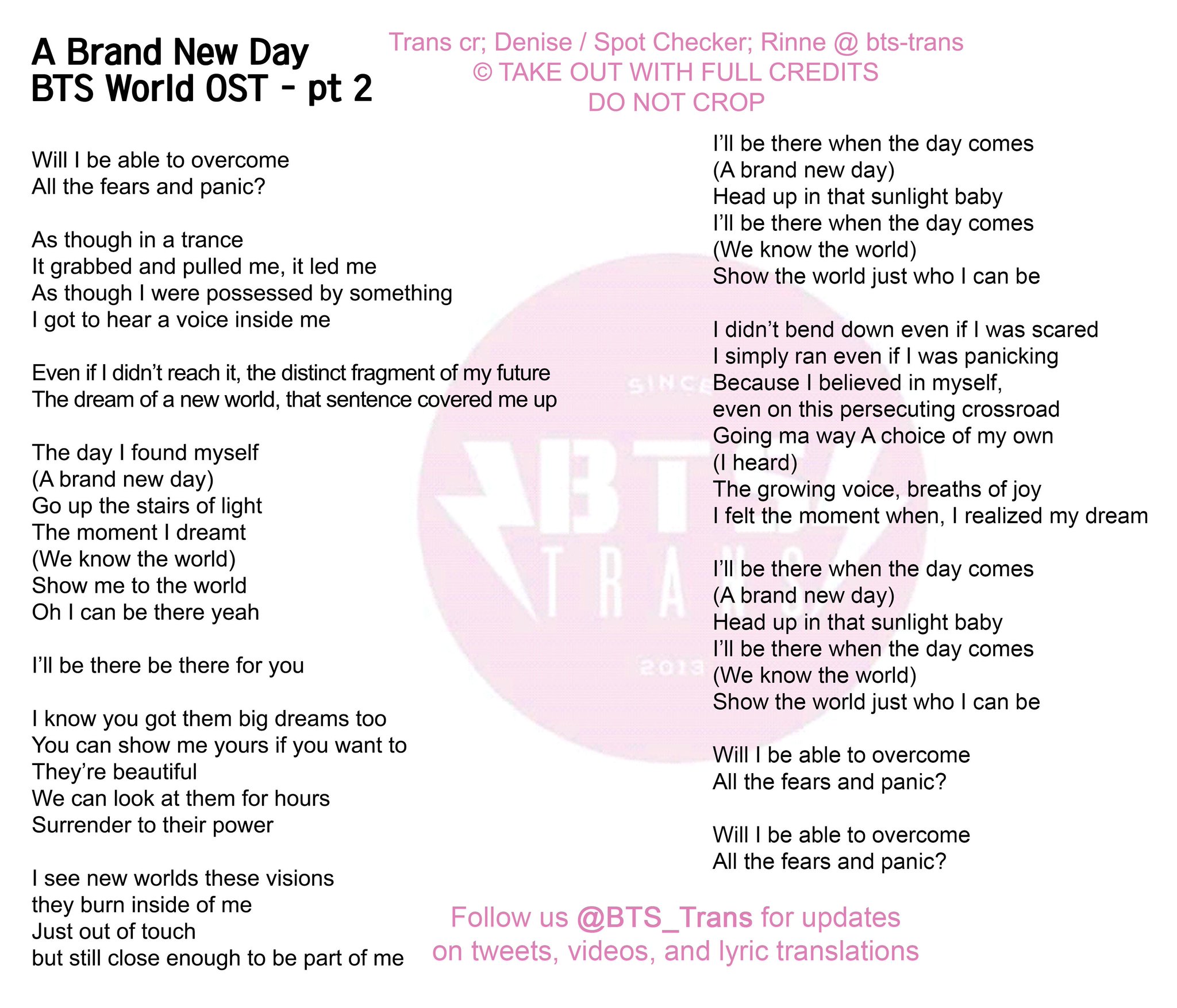 It could happen to you just like it happened to me. Learn english with songs lyrics. Translations of a brand new day (bts. czech ik95. Original lyrics of a brand new day (english translation) song by bts. A brand new day lyrics. I see new worlds these visions. Turn the clock all the way back. Well it's your hometown i think i've outgrown i wanna travel the world but i, i just can't do it alone so i'm just waiting on fate to come wrap around me think about all the foreign come away with me just think of all the places we could be i'll be waiting, waiting on a brand new day. Brand new day is a song released by shikuramen on the universal music label on april 12th, 2019. Please help to translate a brand new day (bts. english, korean → greek marypop. A brand new day (english translation). Gaana offers you free, unlimited access to over 45 million hindi songs, bollywood music, english mp3 songs, regional music & mirchi play. .on a brand new day writer/s: